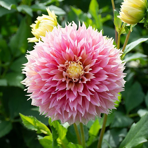 The fabulous 5” blossoms of Laciniated Dahlia ‘Kogane Fubuki’ are irresistible for two reasons. First is the rounded, appealingly shaggy form that can be traced to petal tips that sport a fine fringe (and may have inspired use of the name ‘Fubuki,’ which means ‘snowstorm’ in Japanese). Next is the remarkable variability in the coloration of these flowers. While many arrive with pale pink petals tipped in golden yellow, our trials produced broad variations in those two colors – with some blossoms a solid, darker pink and some solid yellow, and everything in between. Our staff even checked to be sure the flowers were all coming from the same plant. They were. This is a gorgeous chameleon for gardens and vases.