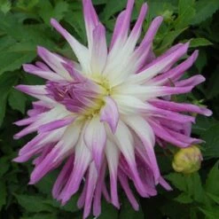 Dahlia ‘Mingus Randy’ is a refreshing Semi-cactus form with cool white petals tipped in bright lavender. These impressive 9–10″ blooms blend well with airy masses of Verbena bonariensis and are equally effective with contrasting yellow tones.