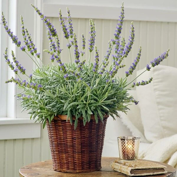 For nearly 20 years, our customers have enjoyed this tender Lavender hybrid indoors during the long winter months. ‘Goodwin Creek Grey’ is well-suited to the dry conditions of our houses, and throws spikes of deep blue flowers above a lush mound of silver foliage. Just keep its pot in a sunny, south window. One bushy plant sent in a 7″ woven basket.