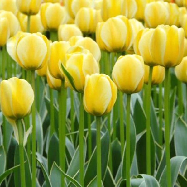 Golden yellow flames feather the petals of this serene, creamy white Darwin Hybrid Tulip, adding a charming, cottage-garden touch to the border. As the flowers of ‘Jaap Groot’ mature, the yellow gently fades. White-trimmed leaves are an additional treat you’ll enjoy all season long. A reliable, strong, perennial selection. Midseason.