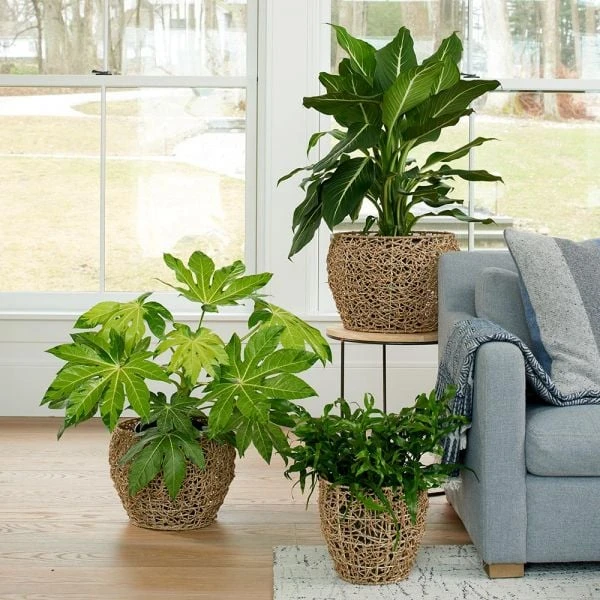 These Twine & Vine Baskets display your indoor plants in an appealingly naturalistic style. These beautiful baskets are made using twine fibers that are intricately woven around a sturdy, rounded wire frame. Superb alone, they also make a handsome grouping.