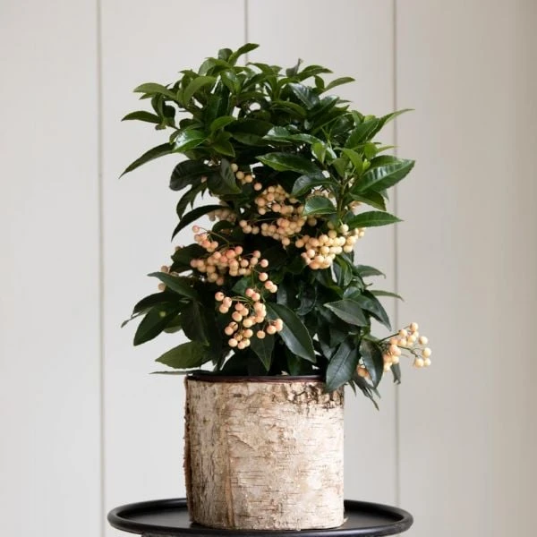 Generous clusters of cream-colored berries adorn the lower tiers of this White Coralberry (Ardisia crenata ‘Bospremium’), bringing a hard-to-find, all-natural decoration to your holidays. The berries show nicely against the dark green foliage of this carefree seasonal favorite. Complementing the tone of the berries is our rustic Birch bark cachepot, measures approximately 6″ wide x 5½” tall.